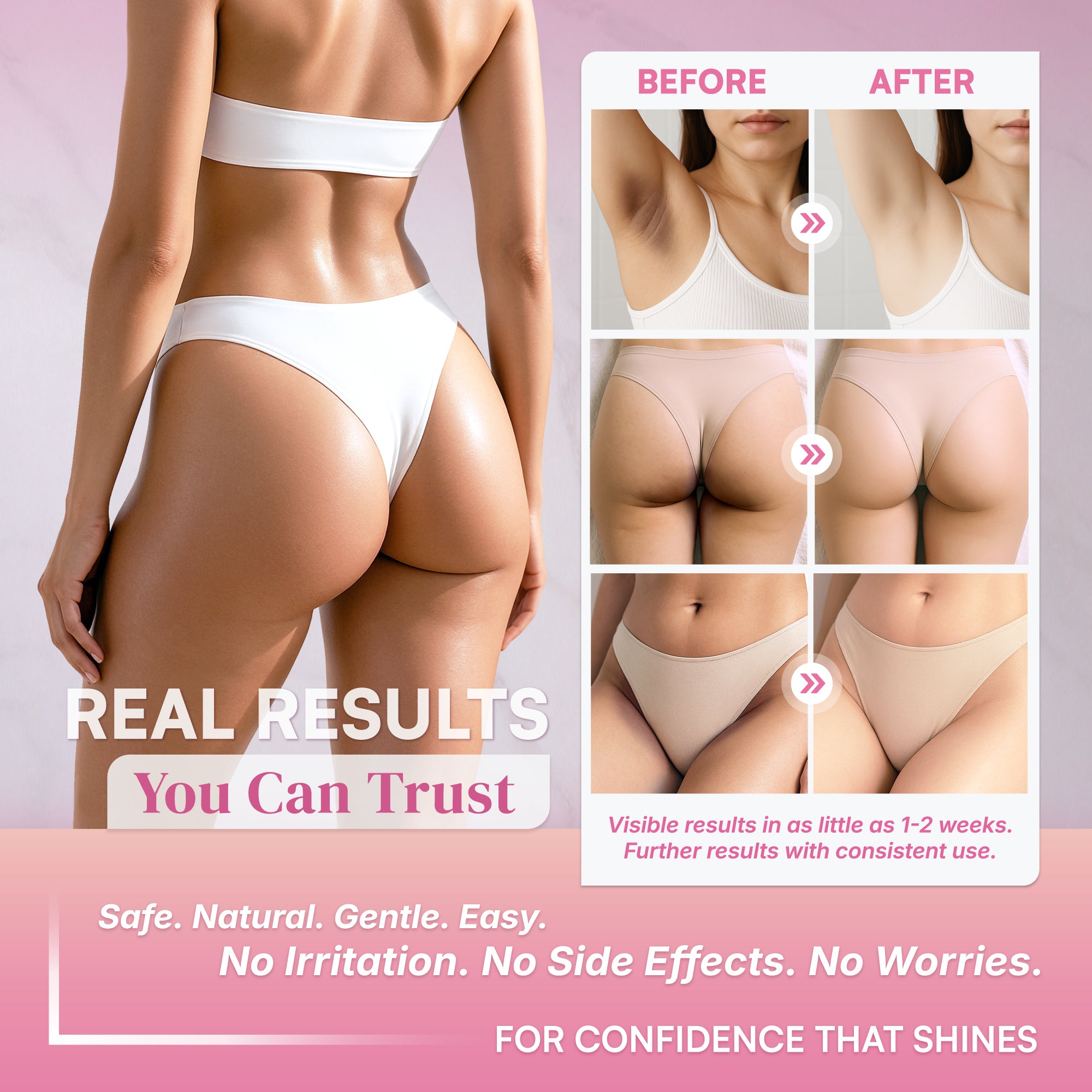 This is safer than using harsh chemicals because it works gently with the natural process of your skin. Harsh bleaching chemicals like hydroquinone, on the other hand, can damage skin cells and cause irritation, scarring, permanent discoloration and other potential side effects. Who would use that on their intimate areas?